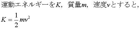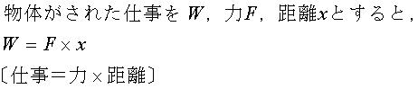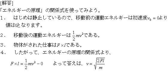 [例題] 静止している質量mの物体が、一定の力Fで距離lだけ動かされて、速度がvになった。速度vを求めなさい。