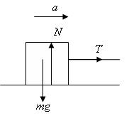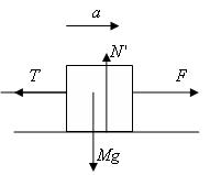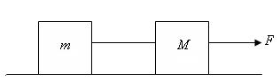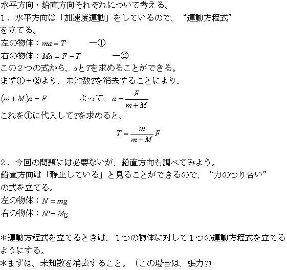 図のように、軽い糸でつながれた2つの物体(それぞれの質量はm,M)が、力Fで右向きに引かれ、一体となって加速度運動をしている。このときの加速度の大きさaと、間の糸の張力Tはいくらか。